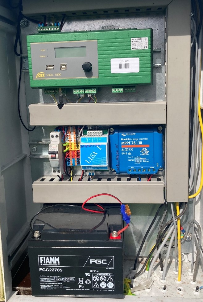 Le datalogger ou "centrale de mesures" est un appareil qui regroupe toutes les mesures des capteurs de la station météorologique pour les enregistrer et les transmettre au serveur qui fournira les données pour la plateforme Agromet.be. Le datalogger qui équipe toutes les stations du réseau est un modèle NetDL 1000 du fabricant OTT. (https://www.ott.com/fr-fr/produits/lenregistrement-des-donnees-et-de-telemetrie-69/ott-netdl-176/) Le boîtier est équipé d'un écran analogique permettant de consulter les données en direct. Une fenêtre de maintenance à distance est disponible pour faire des modifications ou vérifications depuis le centre de recherche de Libramont. |
