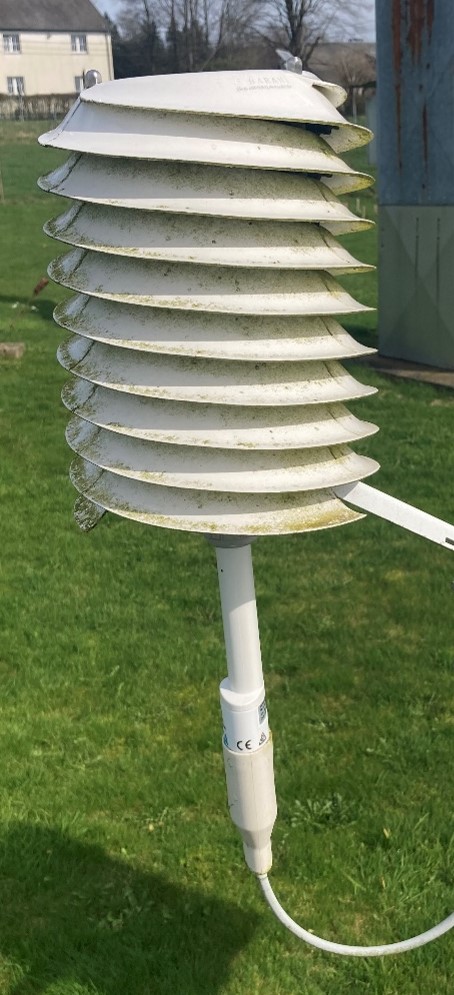 Pour avoir une mesure fiable de l'humidité relative et de la température de l'air, les stations sont équipées par des sondes thermo-hygrométriques. Le modèle de la sonde est HMP155 du fabricant Vaisala. Le capteur est protégé par une partie solide et un filtre en téflon fritté, pour bloquer l'eau liquide, la poussière et la saleté. La sonde est installée dans un abri MeteoShield - Professional qui est conçu par l'entreprise Barani Design. Cet abri offre une protection contre le soleil, la saleté, la pluie, la neige, le sable et la poussière. (https://barani-design.myshopify.com/products/meteoshield-professional) La maintenance de la sonde HMP155 est effectuée une fois par an chez le fabricant avec une calibration de l'appareil pour assurer une exactitude de mesure de données.
