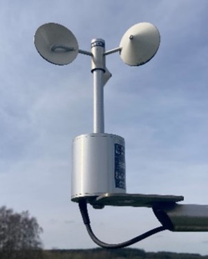 Le suivi de la vitesse du vent se fait à l'aide d'un anémomètre à coupelles, le modèle A100R du fabricant Vector Instruments. La prise de mesure de la vitesse du vent provient d'un aimant situé à l'ntérieur de l'anémomètre qui permet à un interrupteur à lames souples d'établir et de rompre le contact une fois par révolution du rotor. (http://www.windspeed.co.uk/ws/index.php?option=displaypage&Itemid=67&op=page&SubMenu) |